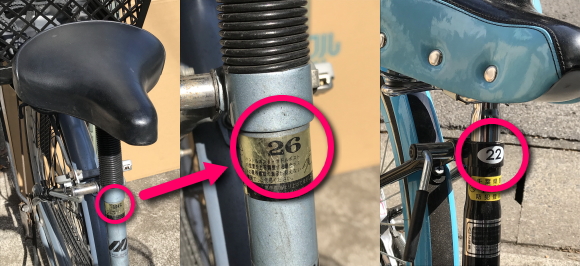 ■タイヤの側面が劣化して、上記のようにはっきりとしていない時もあります。どうしてもわからない時は、サドルの下にシールが貼ってあることがあるので確認してみてください。