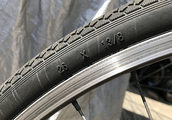 下の写真の場合、26×1 3/8 がタイヤのサイズです。